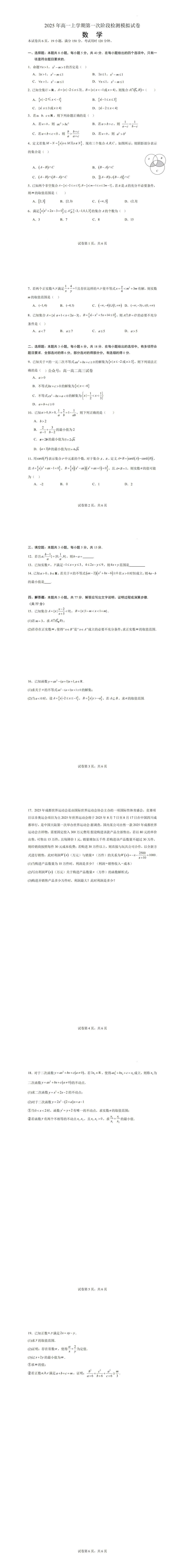 2025年高一上学期第一次月考数学模拟试卷