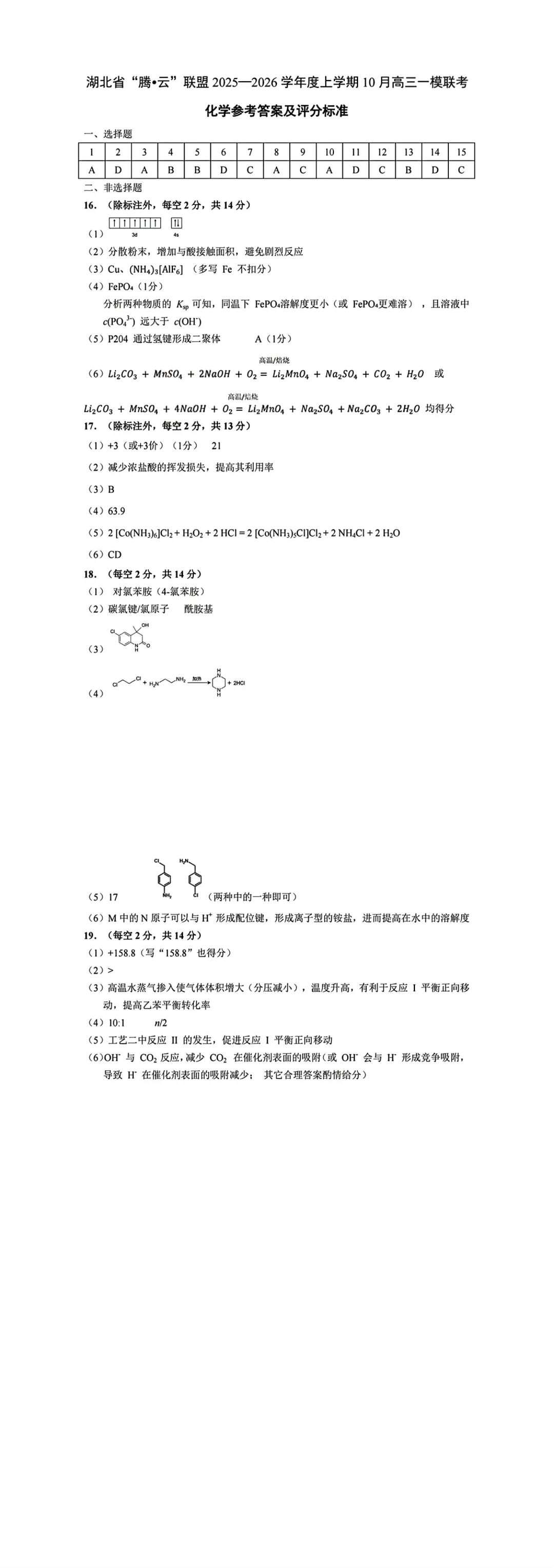 10月云联盟分数线+湖北省腾云联盟2026届高三10月化学试卷+答案