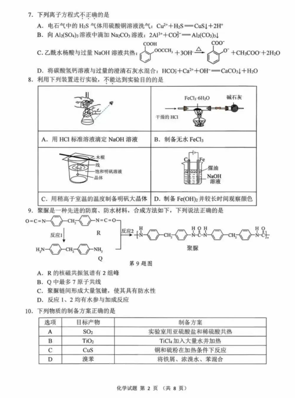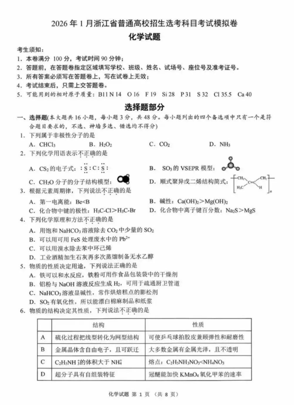 2026年浙江首考化学试卷情况