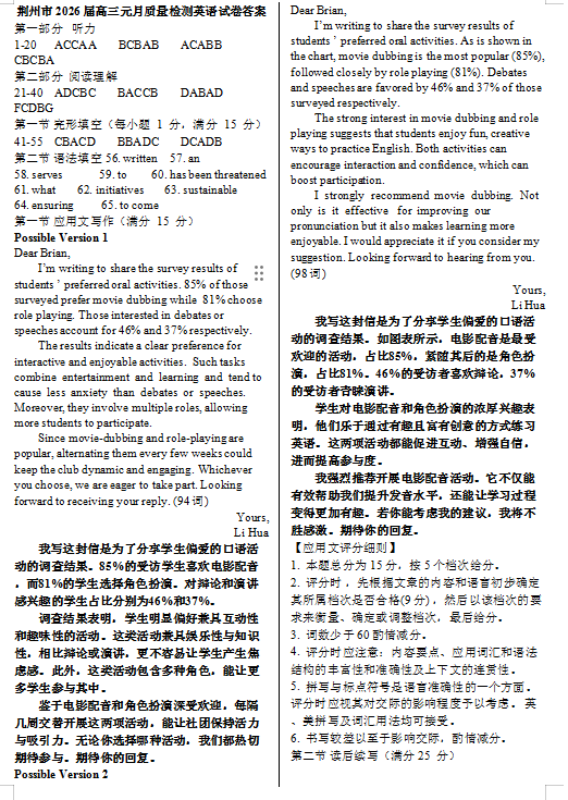 2026届高三年级元月质量检测英语试卷+听力+答案